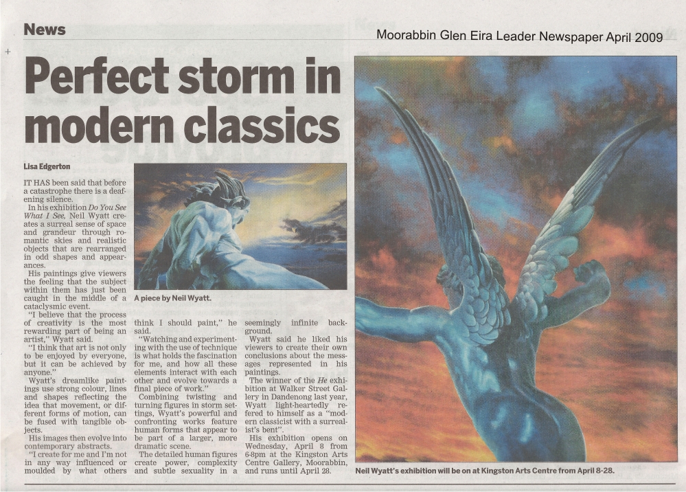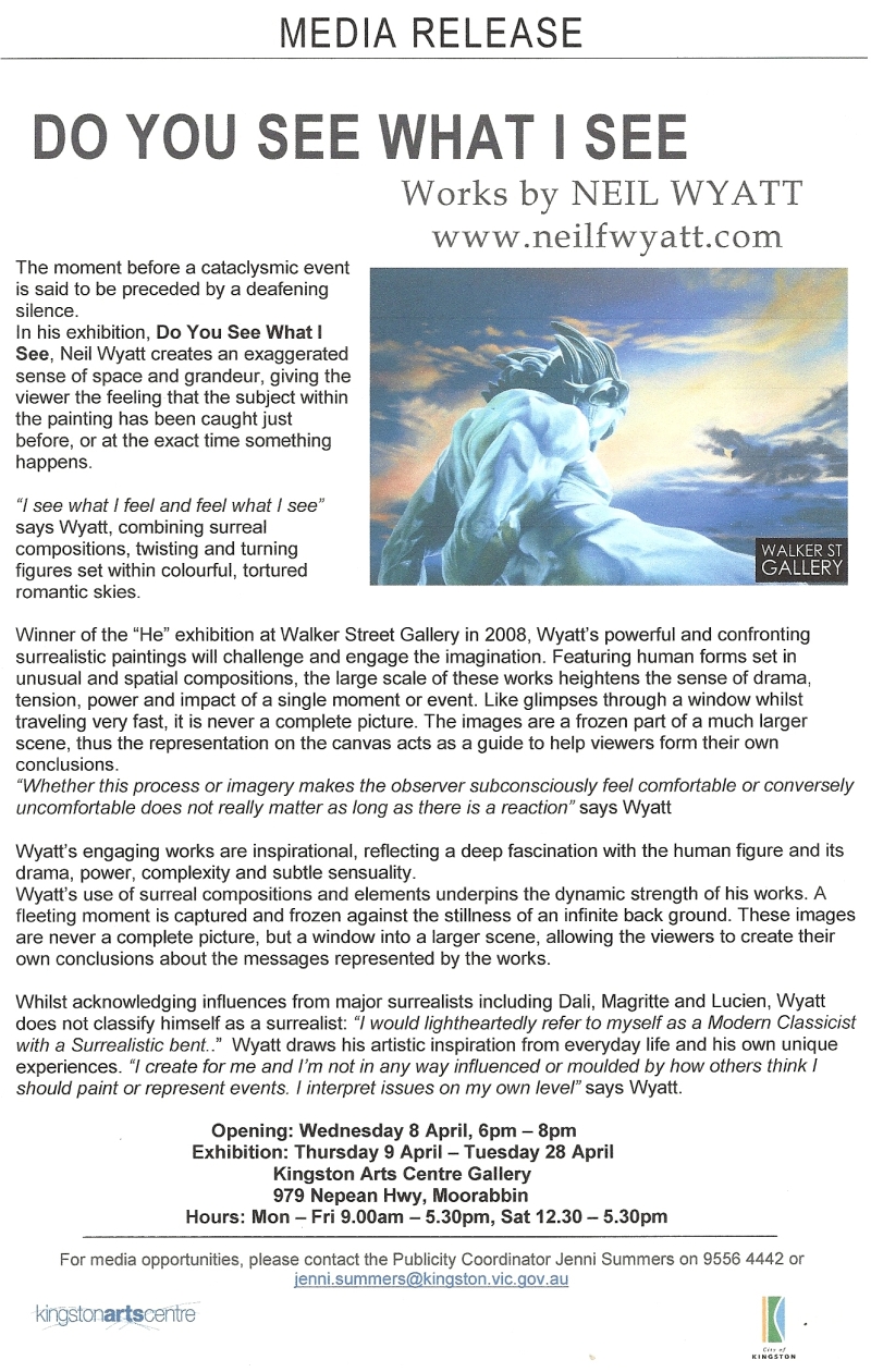 “My present work reflects an ongoing exploration of the complexities of the human figure caught within a dramatic moment in time. The psychological portrayals of figures placed in totally ambiguous situations lift my compositions and sculptural images to a higher level of emotional engagement. My goal is to push each work to the edge so that I, as an artist, will continue to search, investigate and discover new untapped creative energies and visual directions. I strive to involve the viewer, attempting to challenge, confront and engage. I am aware that my compositions are at times bold and confronting. At the end of the day, if an individual walks away from my work with a sense of its understanding, dislike or appreciation, if they are confused or perplexed by it, then I as the painter would honestly feel I have achieved my objectives”.